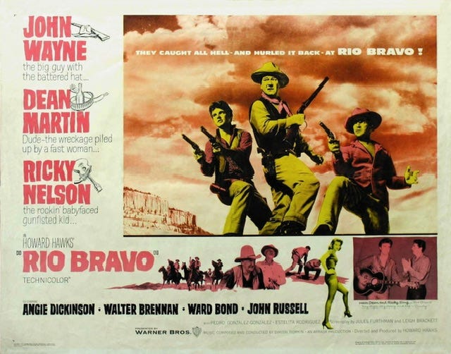Among the movies are the Howard Hawks alternative to a heralded film about a town that won’t defend itself, High Noon. It’s Rio Bravo (1959) with John Wayne, Dean Martin and Ricky Nelson, which I watched in Sid Grauman’s Chinese Theater. In the same theater, I also watched American Graffiti and Casablanca (stand by for a delayed review of Noah Isenberg’s book about the 1942 film).