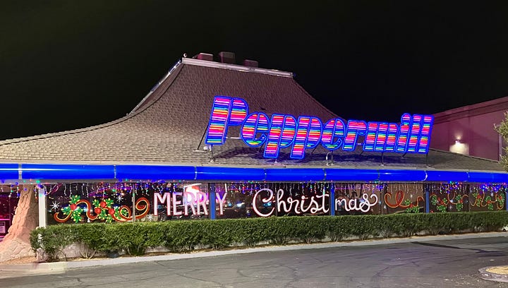 Las Vegas is geared, gamed and engineered to control, test and gauge your every action. Almost every bet, step, expenditure, choice and movement is tracked, calibrated, filmed, studied and factored as a stimulant for profit, even if some of these measurements and “metrics” are vapid and short-sighted. Ultimately, you’re in control. Local friends took me offstrip, to the Peppermill diner, for instance, a fabulously neon-lit restaurant and fireside lounge—featuring a looping video retrospective of classic Las Vegas shows—that’s celebrating its 50th anniversary.